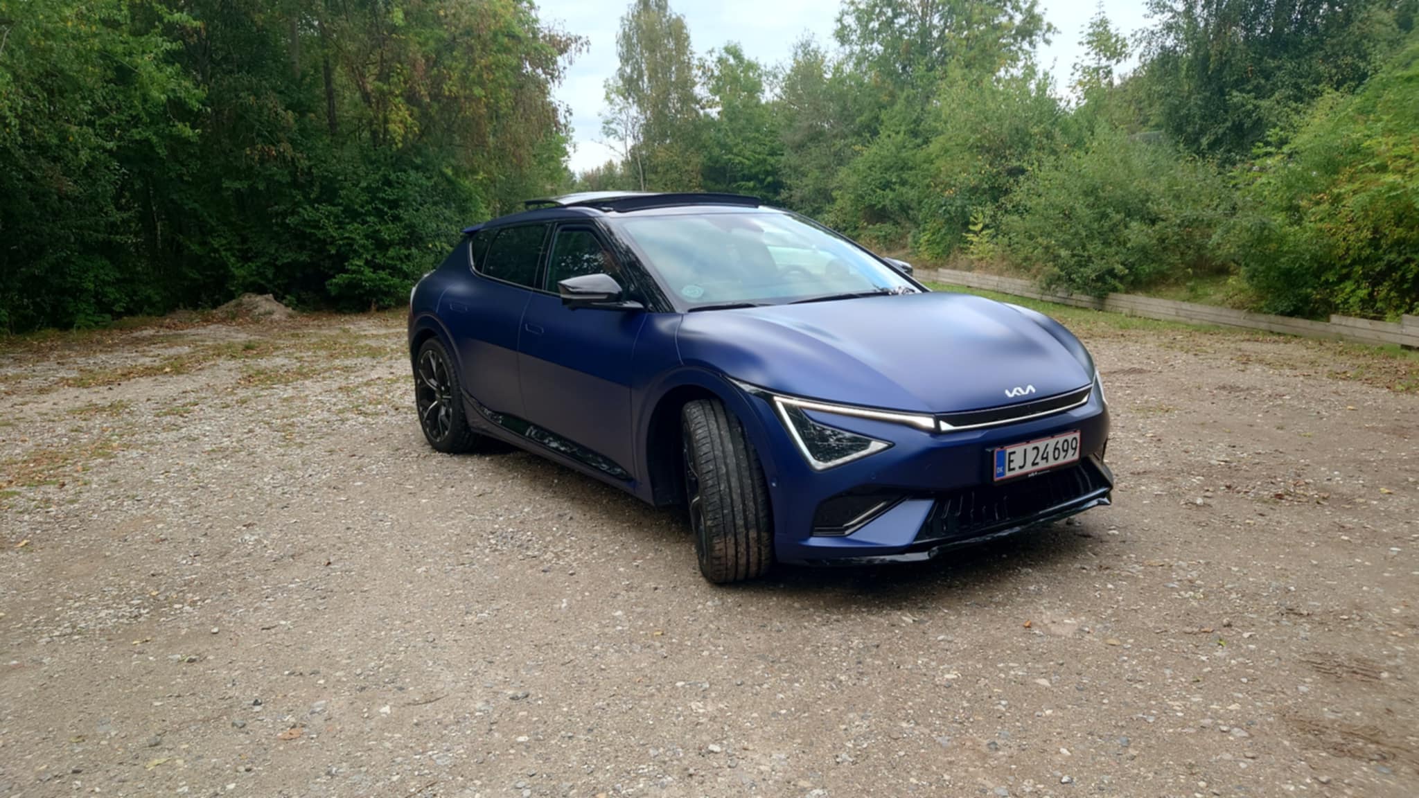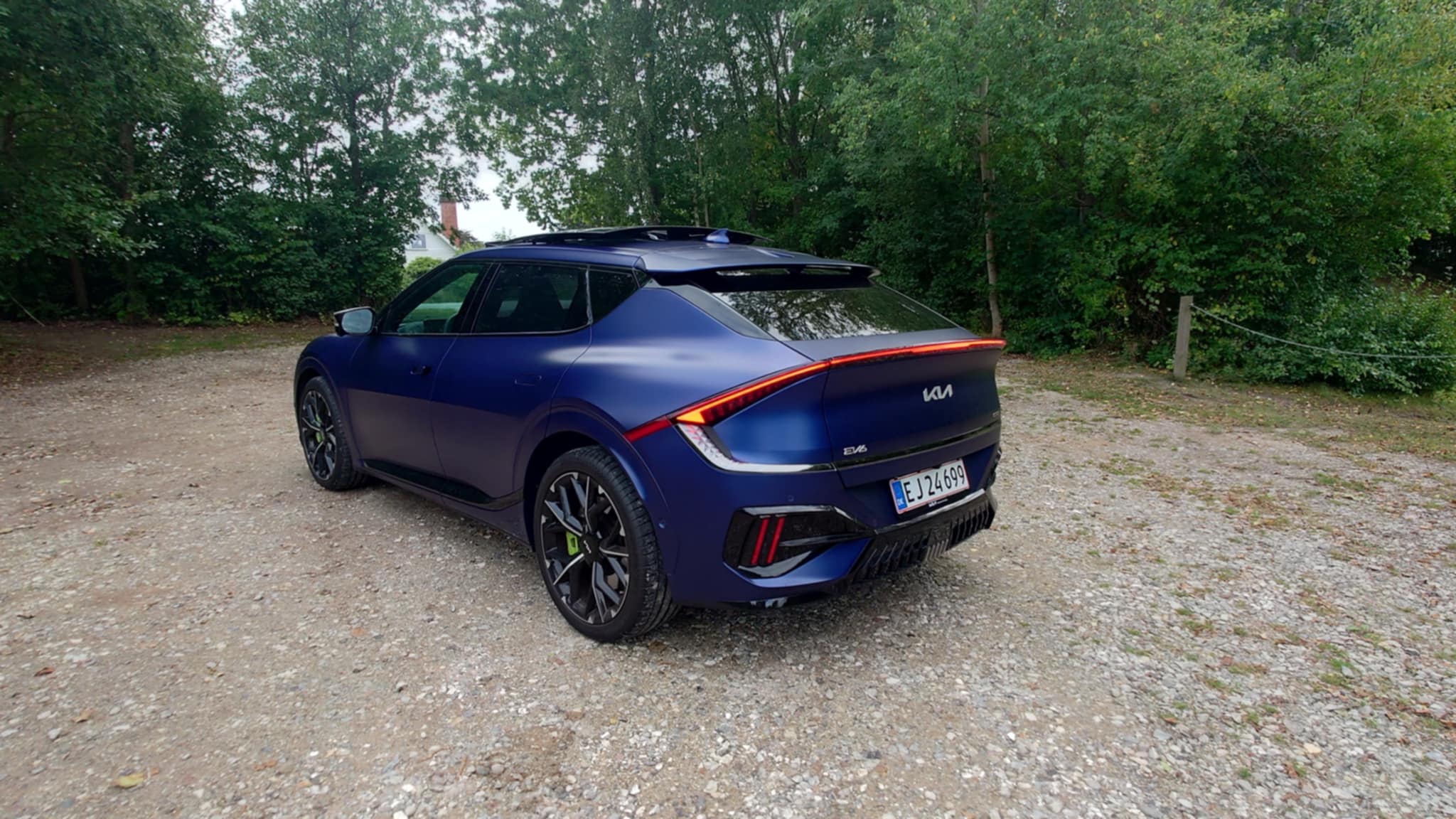 Udvendigt er det ikke nemt at se, at VI har med en af de helt vilde versioner at gøre. Forskellen mellem en EV6 GT og en EV6 GT-Line kan være svær at spotte, medmindre man ved, hvad man skal kigge efter. I GT’s tilfælde er de grønne bremsekalibre det mest iøjnefaldende kendetegn. Indvendigt er den også anderledes, men mere om det længere nede. Sidste år kørte vi den tidligere EV6 GT, som vi dog aldrig nåede at anmelde, da vi kun havde den til test i ganske få dage. Jeg husker dog, at den var hurtig, men haltede på rækkevidden, og så var komforten heller ikke særlig imponerende. Det har KIA gjort noget ved i den opdaterede model. Den er blevet meget mere komfortabel. Sæderne ligner de forrige, men alligevel sidder man bedre i dem. I EV6 GT sidder du lavere end i den almindelige EV6, hvilket gør køreoplevelsen mere intens – næsten som i en sportsvogn, i det omfang en tung SUV nu kan tillade det. Batteriet er vokset til 88 kWh mod tidligere 77,4 kWh. Prisen for EV6 GT starter fra 499.999 kr., men testbilen var udstyret med den matte blå lakering til 23.999 kr.