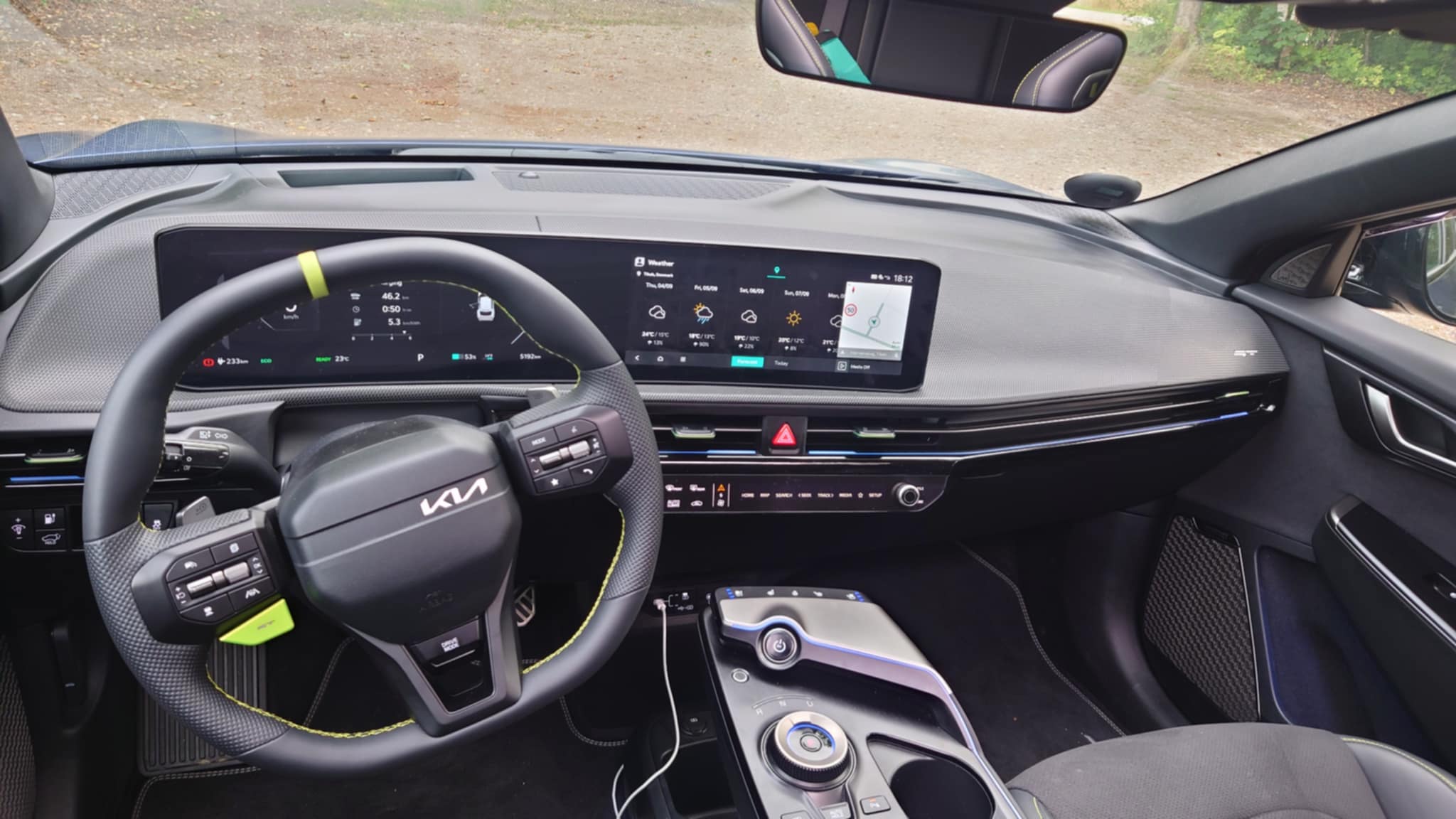 Kabinen i EV6 GT adskiller sig markant fra den mere civile EV6. Som nævnt har den sportslige sæder, der både støtter og samtidig giver højere komfort end tidligere. EV6 GT er en elbil, de fleste sagtens kan køre langt i - også passagererne på bagsædet. Pladsforholdene er fortsat blandt de bedste i klassen. Foran finder føreren samme store touchskærm samt den smarte mindre skærm nedenunder, hvor man kan styre lyd, klima og andre basale funktioner. Løsningen fungerer overraskende godt: ét tryk på en knap, og undermenuen skifter fra lyd til klimaanlæg. Selvom det ikke er fysiske knapper, er det stadig nemmere end at navigere i underliggende menuer. Rattet er unikt for GT og har en stor grøn knap med “GT” på. Trykker du på den, er EV6 GT klar til at bringe alle sine kræfter ned på asfalten. Bagagerummet rummer 530 liter, og med bagsæderne lagt ned er der 1.320 liter.