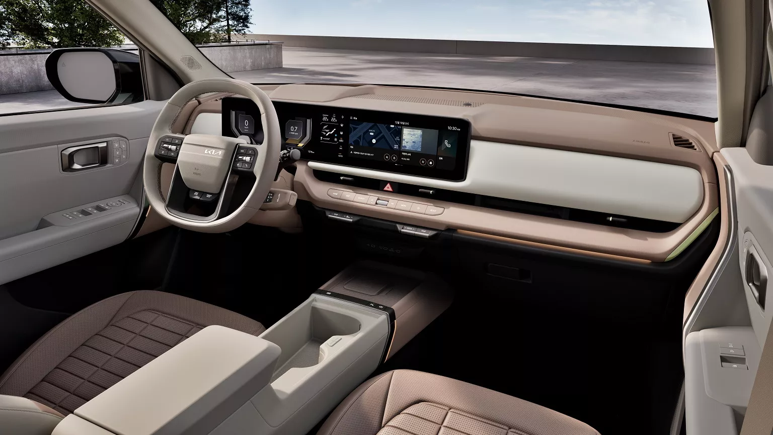 Indvendigt er kabinen næsten identisk med det, som vi kender fra Kias nyeste elbilmodeller. To 12,3" skærme er sammensat til én stor panoramaskærm, mens klimaanlægget har sin egen separate touch-panel. Der er stadig enkelte fysiske knapper til de vigtigste funktioner.